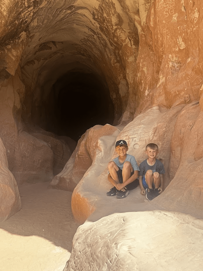 We arrived at Mount Carmel Junction, and I was eager to explore the “Belly of the Dragon” with our children, but my husband had different priorities. He was focused on finding a campsite for the night, suggesting we save our adventure for the following day. I knew that our schedule would be packed with Zion activities, leaving little time for the tunnel. However, as we drove just a short distance down the road, we stumbled upon a primitive campground on the right. To my delight, as we turned onto the road to secure our spot, we passed the Belly of the Dragon, realizing we still had time to visit this fascinating site with the kids. It was such a neat experience. I will not tell you what is through that black hole behind them.
